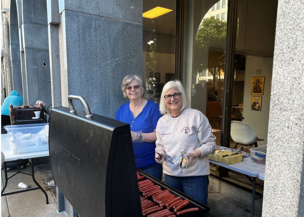 For 14 years, the Wednesday Morning Breakfast Ministry has provided food, clothing, and companionship to those in need. In front of the Parish Office, visitors enjoy hot egg McMuffin sandwiches and fresh fruit, with volunteers granting full access to the ministry’s supplies storeroom. During summer, a sidewalk café ambiance is created with tables and chairs, offering a warm and inviting experience.